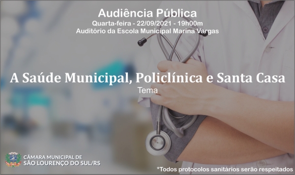 A Câmara Municipal de Vereadores de São Lourenço do Sul CONVIDA a comunidade em geral para uma Audiência Pública Presencial no dia 22 de Setembro, quarta-feira, a partir das 19 horas, no Auditório da Escola Municipal Professora Marina Vargas, referente á SAÚDE PUBLICA NO MUNICÍPIO, a fim de discutir, debater e buscar soluções especificamente quanto ás competências nos atendimentos da Policlínica Municipal 24 horas e do Hospital Santa Casa de Misericórdia de São Lourenço do Sul.