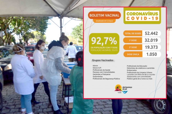 São Lourenço do Sul chega a 92,7% da população vacinável (a partir de 12 anos até 16 com comorbidades e a partir de 17 anos), com a primeira dose da vacina aplicada. São 33.069 pessoas com a primeira dose ou dose única, sendo que 20.423 (57,25% da população vacinável) já estão com o esquema vacinal completo (segunda dose ou dose única). Totalizando 52.442 doses aplicadas.