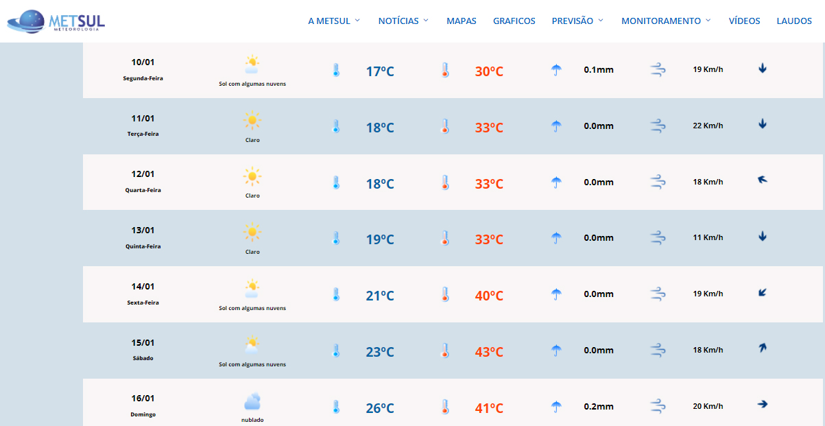 Segundo a previsão da Metsul Meteorologia, São Lourenço do Sul pode ter temperatura de 43º no próximo sábado e o Rio Grande do Sul deve atingir temperaturas recorde em várias regiões. (Confira na imagem abaixo)