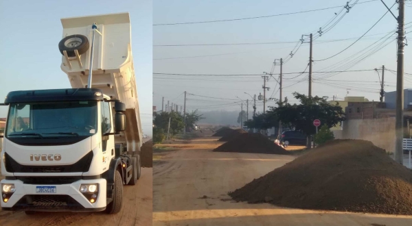 Nesta terça-feira (24) uma das equipes da SMOU trabalha colocando cascalho nas ruas do bairro Sete de Setembro.