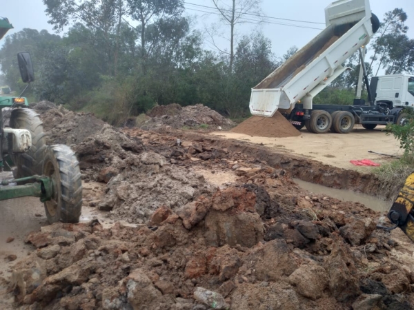 A Secretaria de Obras (SMOU) realiza nesta sexta-feira (22) drenagem na rua Plínio Brauner, esquina Frederico Gehling, no Bairro Sete de Setembro. Após a drenagem será realizada também a colocação de cascalho no local.
