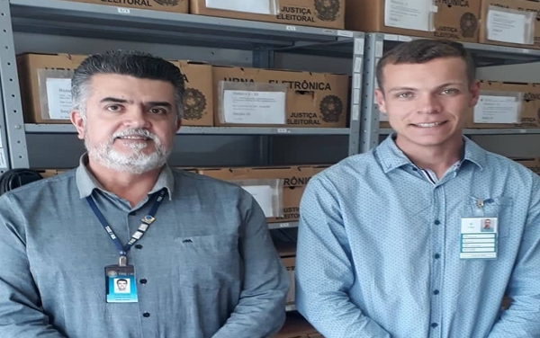 ÀS 13 h desta quarta-feira (21), no depósito das urnas da 80ª Zona Eleitoral, em frente ao Supermercado Guanabara, a Justiça Eleitoral realizou a carga oficial nas urnas eletrônicas. Após, foi realizada fiscalização e auditoria do sistema, podendo ser visualizadas as fotos e dados oficiais dos candidatos e candidatas na urna eletrônica. Conforme o Chefe do Cartório Eleitoral ALEXANDRE GEISLER “buscamos assim a conferência dos dados constantes das urnas bem como a verificação da integridade e autenticidade dos sistemas eleitorais instalados em urnas eletrônicas”. Na foto, o Chefe do Cartório Eleitoral ALEXANDRE GEISLER e o Auxiliar Eleitoral ANDREI LÜDTKE PRIEBE.