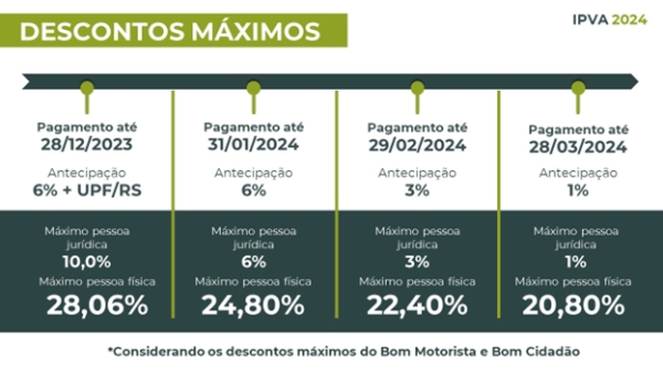 Além dos descontos pela antecipação, os proprietários também podem obter os benefícios de Bom Motorista (conforme multas de trânsito) e Bom Cidadão (conforme CPF colocado nas notas fiscais). Caso tenham direito a todos os benefícios, os contribuintes acumularão descontos máximos de 24,80% (janeiro), 22,40% (fevereiro) e 20,80% (março).