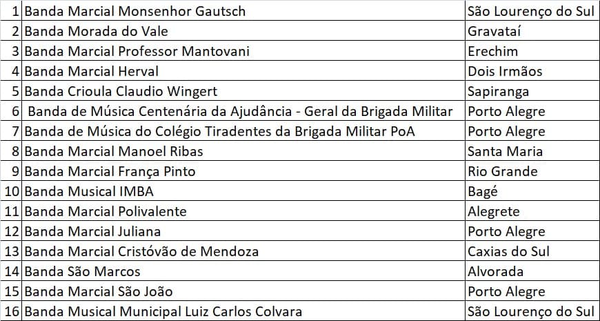 E contará com a participação das seguintes Bandas na tabela em anexo