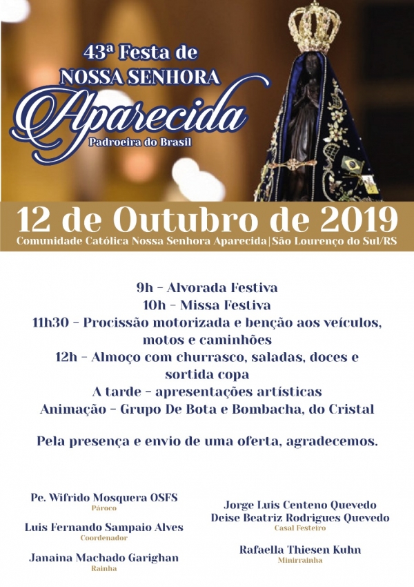 Começaram na quinta-feira (03), as novenas da 43ª Festa de Nossa Senhor Aparecida. A programação culmina com a realização da Missa Festiva no dia 12 de outubro de 2019, sábado, e a grandiosa festa nas dependências desta Comunidade, em São Lourenço do Sul. Na programação, a tradicional Procissão Motorizada de veículos, motos, bicicletas e caminhões pelas ruas centrais da cidade, após a Missa Festiva.