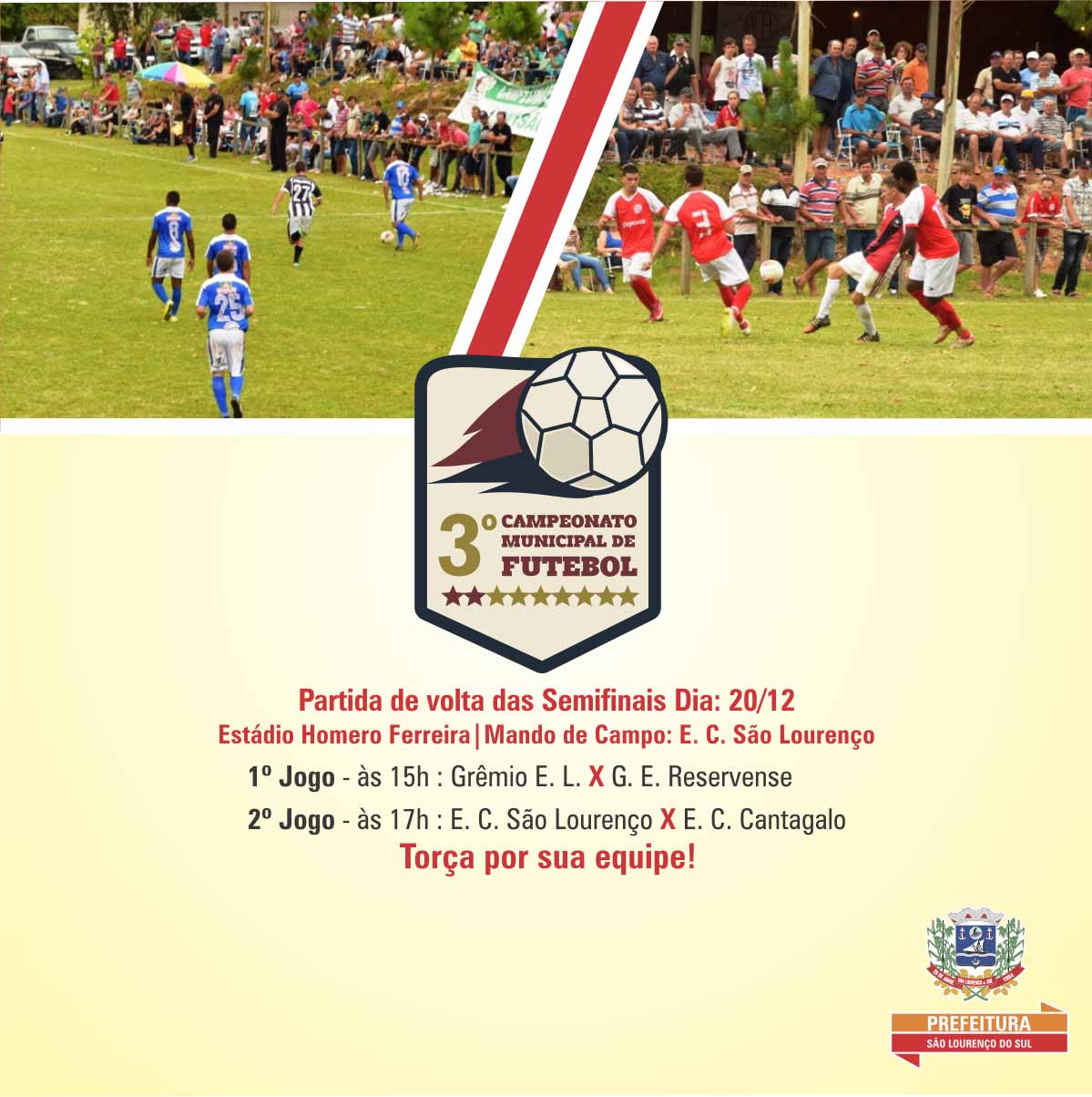 A decisão das semifinais do 3º Campeonato Municipal de Futebol acontece no domingo (20), quando serão disputados os jogos de volta, com mando de campo do Esporte Clube São Lourenço, 3º colocado na primeira fase, no Estádio Homero Ferreira. Na ocasião serão conhecidos os finalistas da competição.