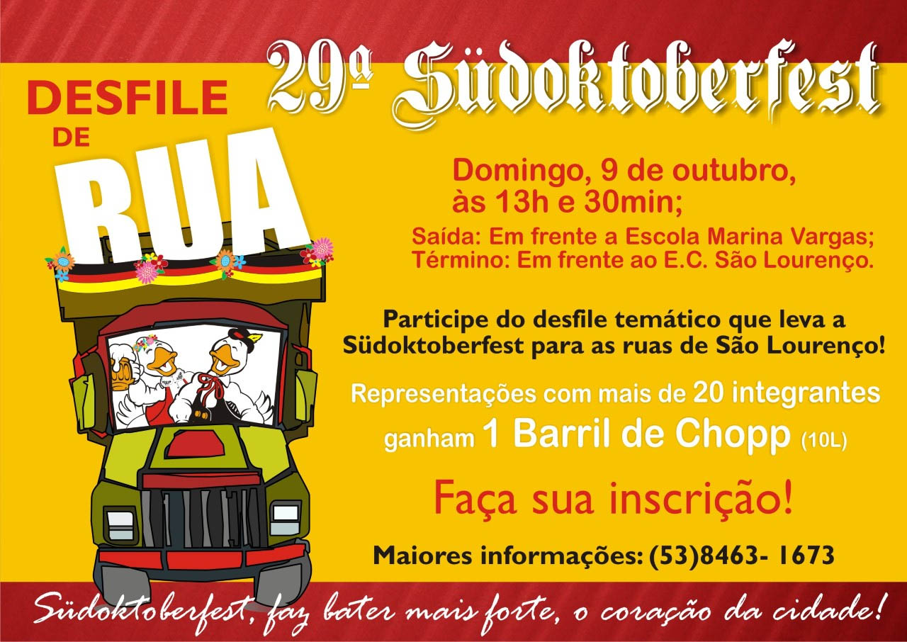O Desfile de Rua Temático da Südoktoberfest acontecerá no domingo, dia 9 de outubro, com concentração em frente a E.M.E.F. Professora Marina Vargas, e saída às 13h e 30min. Para participar é preciso ornamentar o carro, reboque ou outra representação, assim como escolher trajes e adornos, sempre exaltando a cultura alemã-pomerana. Além disso, é necessário confirmar presença através da ficha de INSCRIÇÃO (disponível no site: http://sudoktoberfest.com.br/) e é indispensável a presença de todos os carros e integrantes antes do horário de saída.