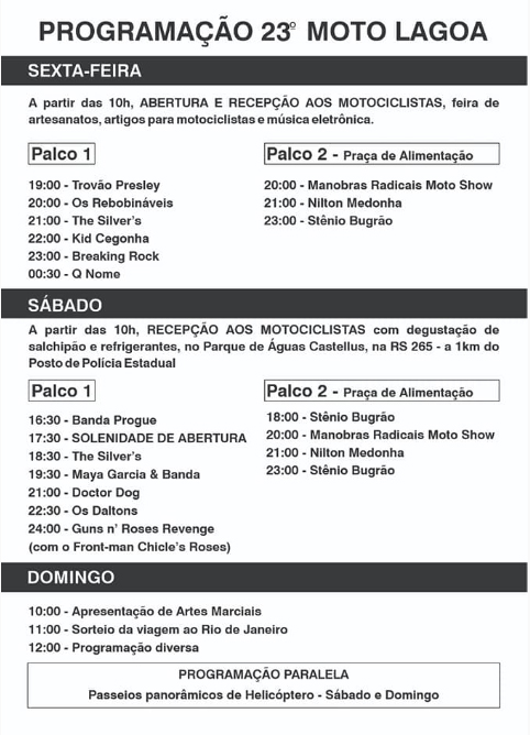 Inicia nesta sexta-feira mais Moto Lagoa. Em sua vigésima terceira edição com uma grande programação (na imagem em anexo) contando com a feira de artesanatos e produtos motociclísticos, praça de alimentação, shows de manobras radicais, passeios de helicóptero, etc.