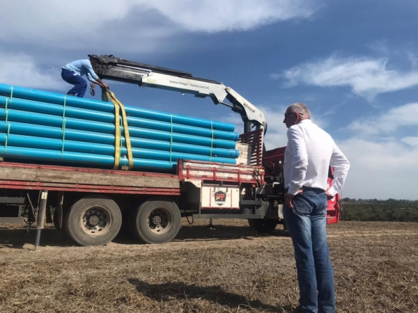 A transposição de água do açude da fazenda Capão do Engenho para o arroio São Lourenço iniciou nesta segunda-feira (13). Canos e adutoras começaram a chegar ao local para dar inicio à instalação da estrutura que permitirá que a água do açude abasteça a barragem de captação existente no arroio São Lourenço. Análises realizadas pela Corsan atestaram que a água é potável, portanto, pode ser transposta para o arroio onde fica a barragem que abastece a cidade. O prefeito Rudinei Härter esteve no local onde será realizada a obra para acompanhar a chegada do material.