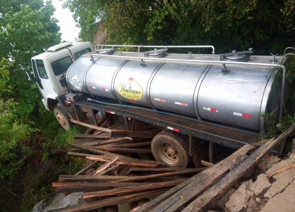 NA MANHÃ da última terça-feira (18) um caminhão que transporta leite para São Lourenço do Sul caiu em uma ponte, a qual cedeu durante a passagem, no interior de Canguçu na localidade de Santa Bárbara-2º distrito. O caminhão é de uma empresa de transportes que presta serviços para a Coopar. Ninguém ficou ferido. O motorista do caminhão, S. K., chegou a consultar em São Lourenço do Sul em função da batida da direção contra o peito mas nenhum problema foi identificado. Esse trajeto é realizado de dois em dois dias há três anos. Nesse delicado trajeto também passa transporte escolar, colocando em risco a integridade das crianças que se dirigem às escolas.