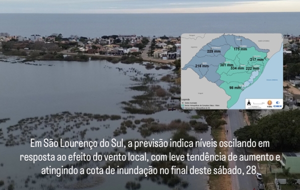 Para a cidade de Arambaré, a previsão indica níveis máximos em torno de 1,60 m, ao longo do intervalo de tempo da previsão, com uma leve tendência de aumento. Em São Lourenço do Sul, a previsão indica níveis oscilando em resposta ao efeito do vento local, com leve tendência de aumento e atingindo a cota de inundação no final deste sábado, 28. Em Rio Grande, o nível oscila em torno da cota de inundação em vários momentos, o fenômeno se dá em função da previsão de ventos de quadrante sul.