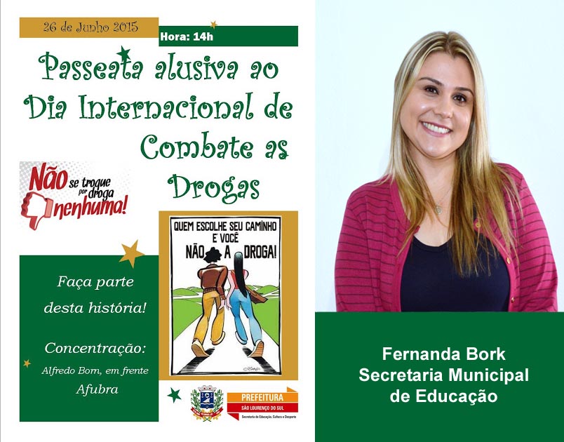 * A Secretaria Municipal de Educação, Cultura e Desporto convida entidades, escolas e comunidade lourenciana a participar, no dia 26/06, da passeata alusiva ao Dia Internacional de Combate às Drogas. A secretária Fernanda Bork, que está à frente da organização do evento, afirma a importância da passeata para chamar a atenção da sociedade a respeito dos efeitos nocivos do uso de drogas e destaca que: “As escolas municipais têm desenvolvido projetos importantes em relação à temática DROGAS e, desde o ano passado, quando foi construído no Fórum de Gestores o calendário letivo de 2015, decidimos realizar a passeata e trabalhar ao longo do ano letivo o conteúdo transversal “DROGAS”, já que sabemos que há o consumo de drogas no município.”