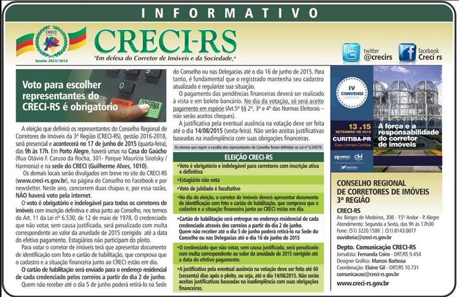 A eleição que definirá os representantes do Conselho Regional de Corretores de Imóveis da 3ª Região (CRECI-RS), gestão 2016-2018, será presencial e acontecerá no 17 de junho de 2015 (quarta-feira), das 9h às 17h. Em Porto Alegre, haverá urnas na Casa do Gaúcho (Rua Otávio F.Caruso da Rocha, 301- Parque Maurício Sirotsky / Harmonia) e na sede do CRECI (Guilherme Alves, 1010). Os demais locais serão divulgados em breve no site do CRECI-RS (www.creci-rs.gov.br), na página do Conselho no Facebook e por newsletter. Neste ano, concorrem duas chapas e, por essa razão, NÃO haverá voto pela internet.