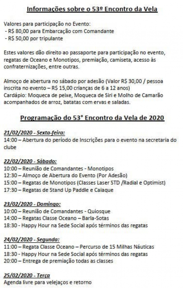 Um dos mais tradicionais eventos do iatismo gaúcho acontece neste mês em São Lourenço do Sul. O 53º Encontro da Vela, que tem como sede oficial o Iate Clube São Lourenço do Sul, será realizado de 22 a 25 de Fevereiro. São aguardados vários barcos e velejadores gaúchos. Ainda não foi divulgada a programação do evento.