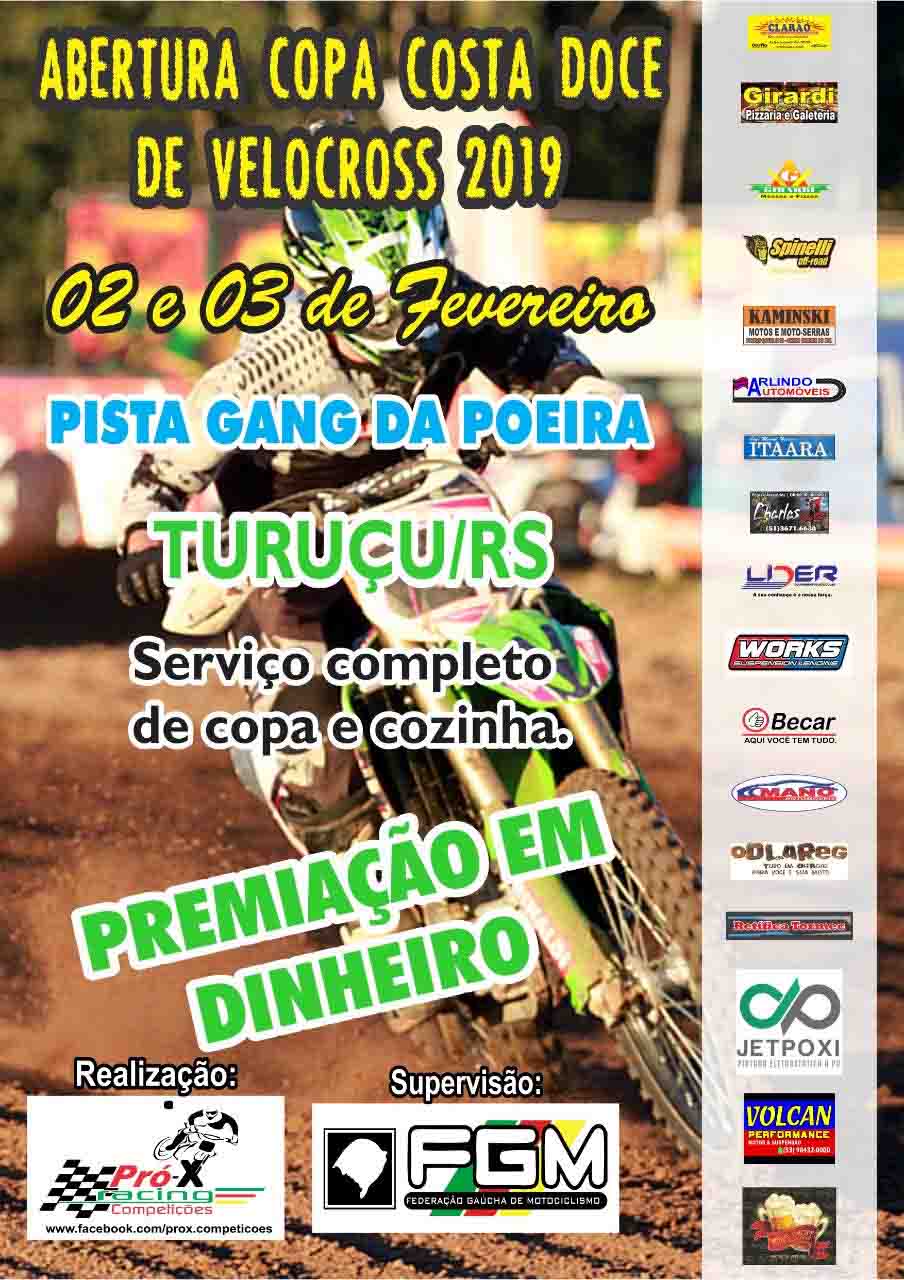 Acontece neste final de semana (dias 2 e 3) na excelente pista da Gang da Poeira, em Turuçu a abertura da Copa Costa Doce e Velocross. O evento esportivo que movimentou a região no ano passado voltou com tudo em 2019 com o destaque de ser a única prova que dá premiação em dinheiro para os competidores. Neste ano a premiação em dinheiro fica entre o 7 primeiros colocados nas baterias com R$100,00 pro 1º Colocado  e R$50,00 para os demais pilotos que participarem das categorias PROMOCIONAL A, 230 PRÓ,  FORÇA LIVRE NACIONAL, FORÇA LIVRE IMPORTADA, VX3 NACIONAL, VX3 IMPORTADA e VISITANTES. A pista de Turuçu, além de ter um traçado competitivo e de ter uma visão quase geral da pista para o público que está olhando as provas, conta com serviço completo de copa e cozinha. Prestigie!!