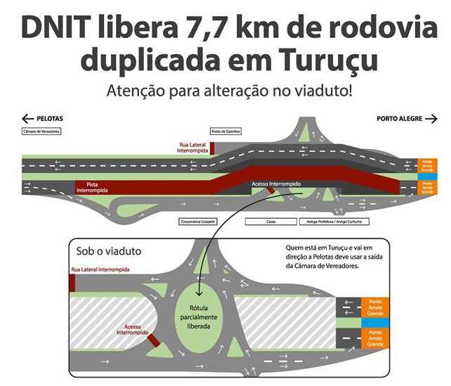 Nesta sexta-feira (13) acontece a liberação de 7,7km de duplicação da BR 116 em Turuçu, (nas proximidades do controlador de velocidade instalado na entrada da cidade até a ponte do Passo das Pedras), incluindo o novo trevo de acesso ao município. A cerimônia de inauguração do trecho vai contar com a presença do Ministro da Infraestrutura, Tarcísio Freitas, e está marcada para as 14h30min.