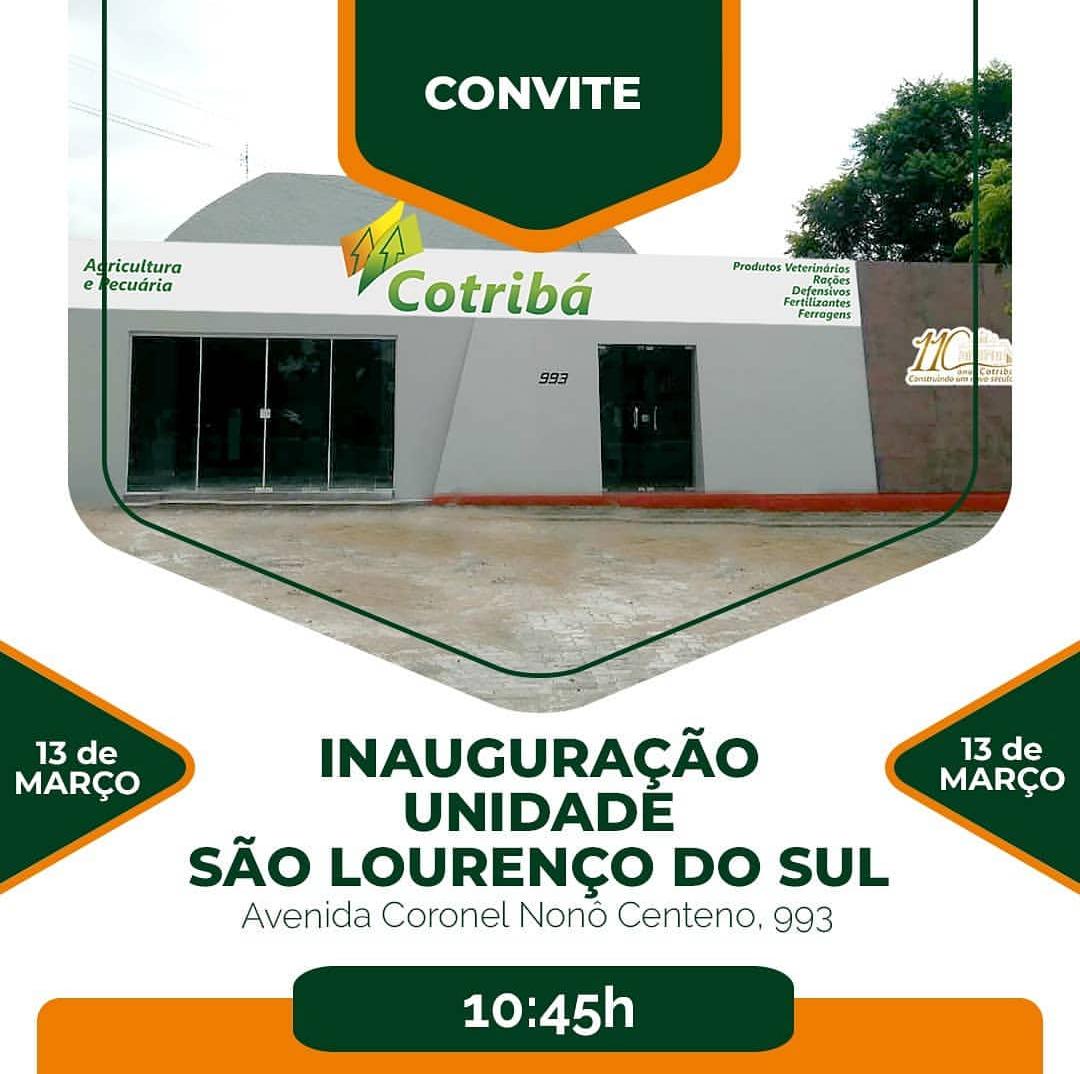 * ÀS 11 h desta sexta-feira (13) aconteceu a solenidade de inauguração da Cooperativa de Ibirubá em São Lourenço do Sul. Ao ato compareceu o Presidente da Cotribá CELSO LEOMAR KRUG, o qual falou sobre a importância da implantação dessa cooperativa em nosso município, destacando que na região sul já existe uma unidade em Arroio Grande. A de São Lourenço do Sul está localizada à Av. Nonô Centeno, no prédio onde funcionava a Agropewi durante anos. Naquele local o produtor rural poderá encontrar produtos veterinários, vestuário para a zona rural (botas, etc), refrigeradores, tv’s e vários outros artigos. Por enquanto a Cotribá não receberá ainda grãos na unidade local. As unidades de Arroio Grande e São Lourenço são gerenciada por Jonas Frankbauer, que é assessorado por GIULIANO DA ROSA. Um bom público prestigiou o evento de inauguração, entre eles autoridades, produtores rurais, técnicos, etc. Trata-se de um importante momento para a população do meio rural lourenciano.