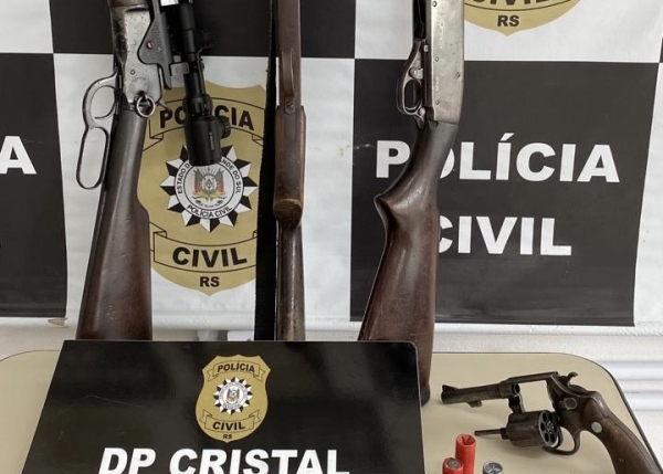 A Delegacia de Polícia Civil de Cristal realizou investigação sobre posse ilegal de armas de fogo na localidade de Armada, interior de Cristal. Na manhã de hoje, 26/11/2024, policiais civis de Cristal com apoio da DP de São Lourenço do Sul realizaram as diligências de busca encontrando uma espingarda calibre 12, uma espingarda calibre 32, um rifle calibre .38 e um revólver calibre .38 e munições destes calibres. O suspeito não foi encontrado na propriedade, ele responderá pela posse ilegal das armas de fogo.