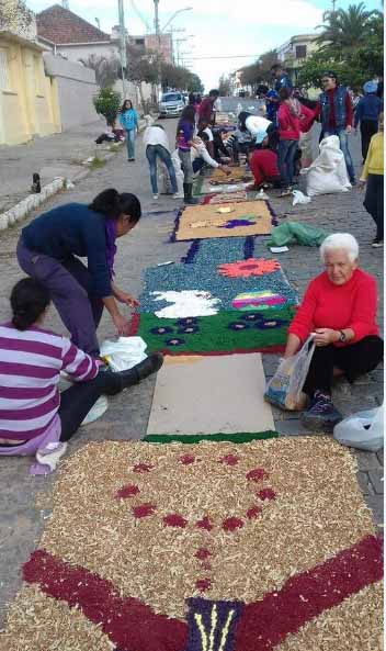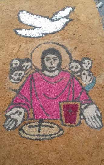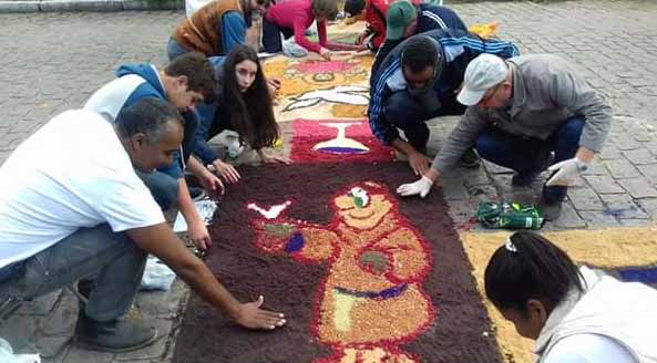 Na manhã desta quinta-feira (26) Fiéis confeccionaram tapetes artísticos para a procissão de Corpus Christi em frente a Igreja Matriz.