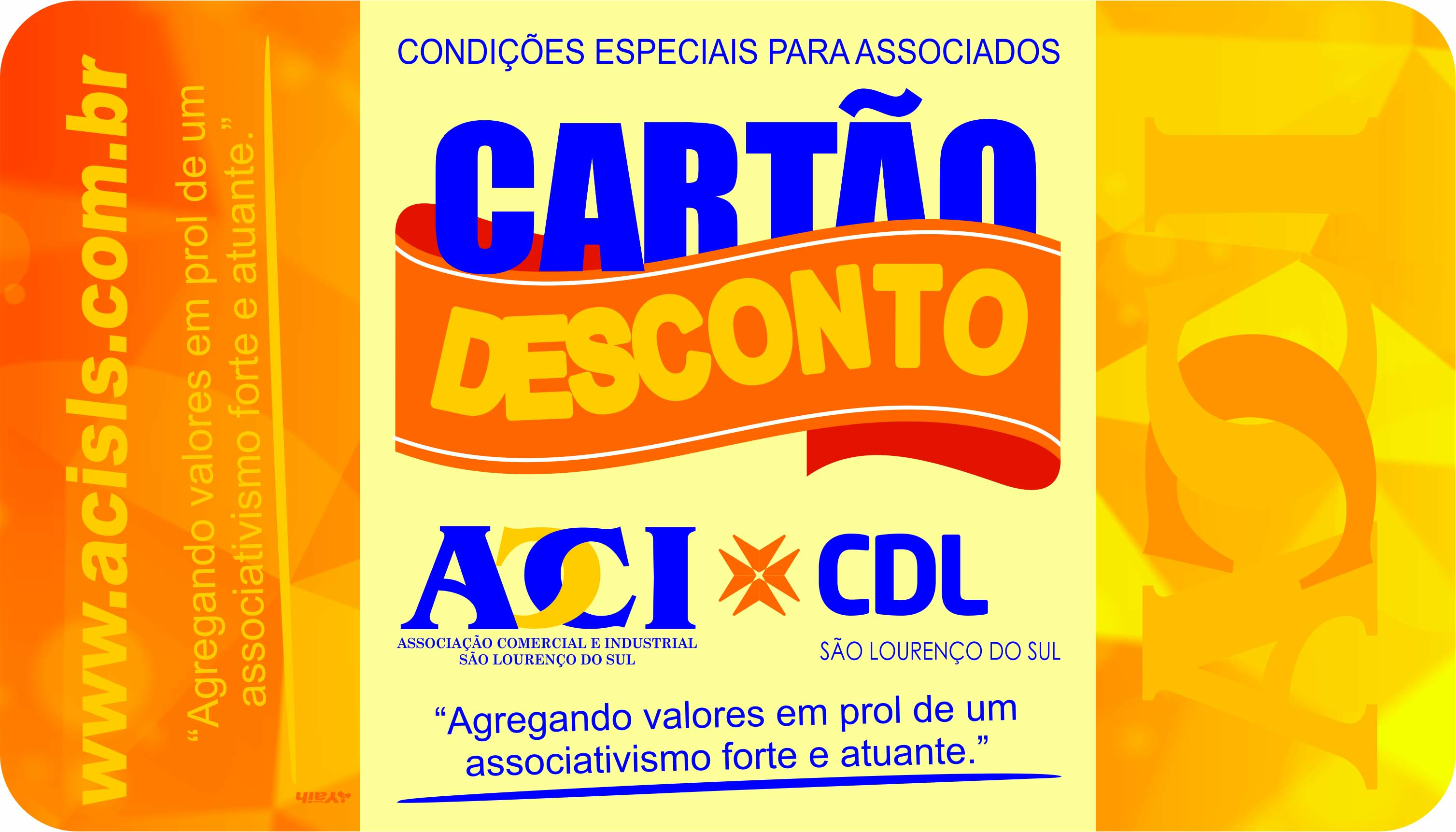 Já está na rua a campanha Cartão Desconto ACI/CDL que visa aumentar o fluxo comercial entre os associados da entidade através de uma rede de descontos em produtos e serviços. O Cartão de Desconto surge como mais uma ferramenta com o propósito de estimular as compras e fixar o cliente em São Lourenço do Sul, chamando a atenção para o comércio local. Em fase de implementação o Cartã Desconto já conta com mais de uma dezena de empresas aderentes, Agência Yaih, Bergmann Máquinas, Círius Interiores, Ferragem Santa Isabel, Foto Arte Bazar, Funerária Braga, Loja Ipê, Lojas Adélia, Ótica Central, RC Wetzel, Risque Rabisque, Restaurante Tropicali’s, Studio Fitmais, fazem parte da rede. As empresas que desejarem maiores informações de funcionamento e adesão da campanha, podem entrar em contato pelos telefones: 3251-3455 / 3251-1426 para marcar uma visita de consultor.