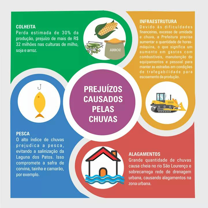 Em São Lourenço do Sul já se projeta uma perda de 30% na produção, um prejuízo de mais de R$ 32 milhões nas culturas de arroz, milho e soja, segundo dados da EMATER. Além das perdas nas lavouras, também perdas na produção de leite, com os danos nas pastagens. Os pescadores não têm peixe por que chove demais.