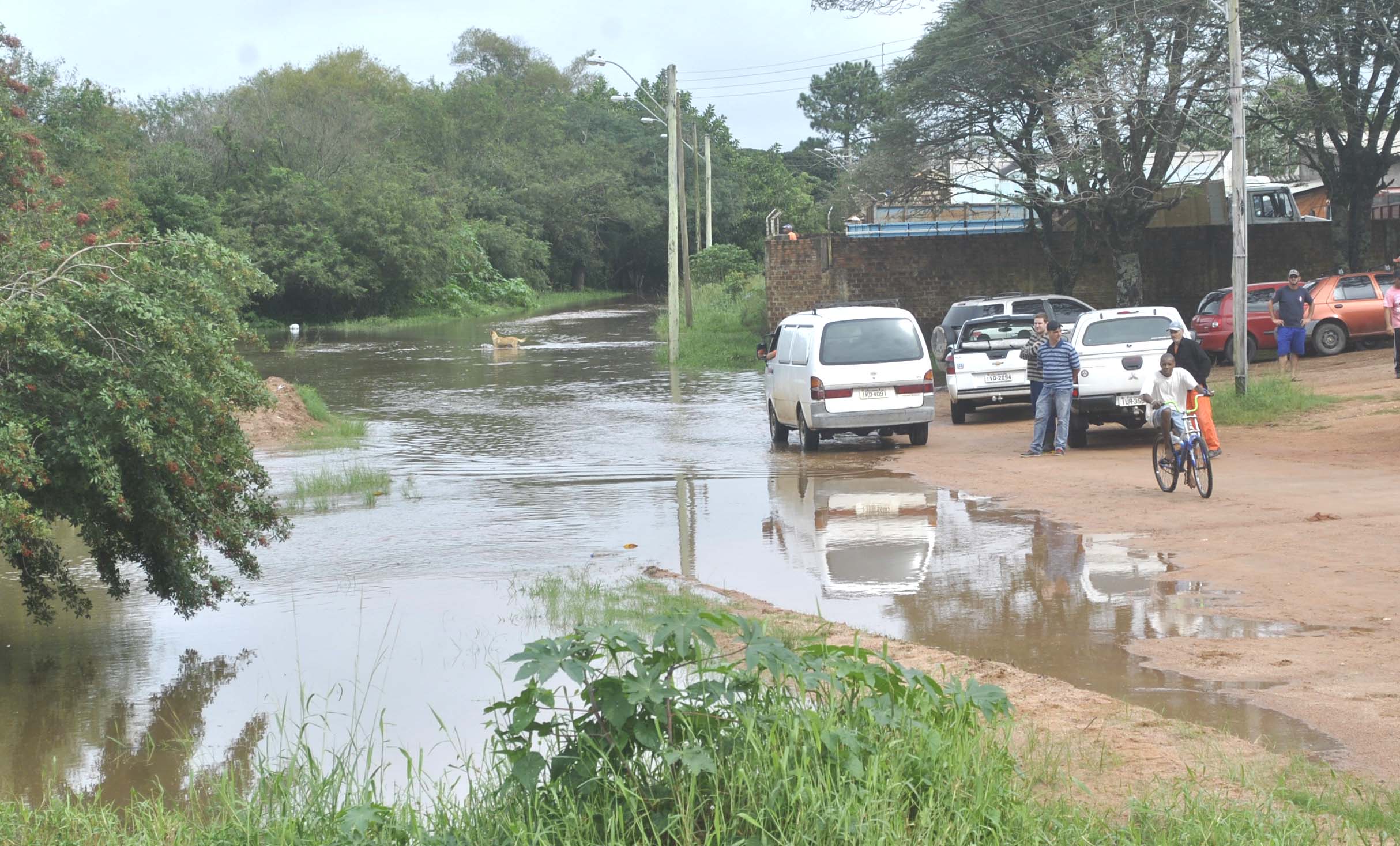 Em alguns pontos como o da foto (na Av. São Lourenço, esquina com o pátio da Secretaria de Obras - Rua Álvares Cabral), a água, que no início da manhã não havia atingido a rua, no momento desta foto (11:10h) já estava bem mais alto, bloqueando o trânsito no local. A Defesa Civil atua monitorando o nível do arroio e auxiliando os moradores das proximidades.