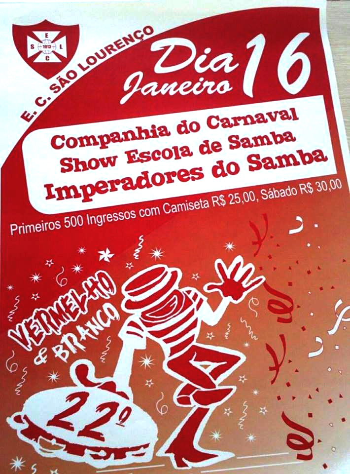 O tradicional Baile Vermelho e Branco, promovido pelo E.C. São Lourenço, acontece a partir das 23:30h deste sábado (dia 16), na sede do clube dando início aos gritos de carnaval em nossa cidade. Este ano o V&B conta com as seguintes atrações: Companhia do Carnaval, Show Escola de Samba e Imperadores do Samba. Os primeiros 500 ingressos com Camiseta custam R$ 25,00 e a partir de sábado os ingressos terão o valor de R$30,00