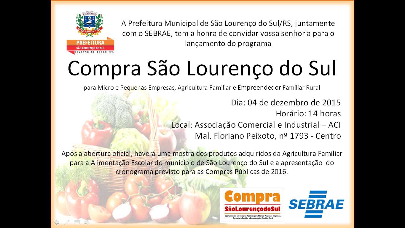 O lançamento do Programa Compra São Lourenço acontece nesta sexta-feira (04) a partir das 14h na Associação Comercial e Industrial (ACI/CDL). Após a abertura oficial acontece uma mostra dos produtos adquiridos na Agricultura Familiar que são destinados a alimentação escolar do município e a apresentação do cronograma previsto para as Compras Públicas de 2016.