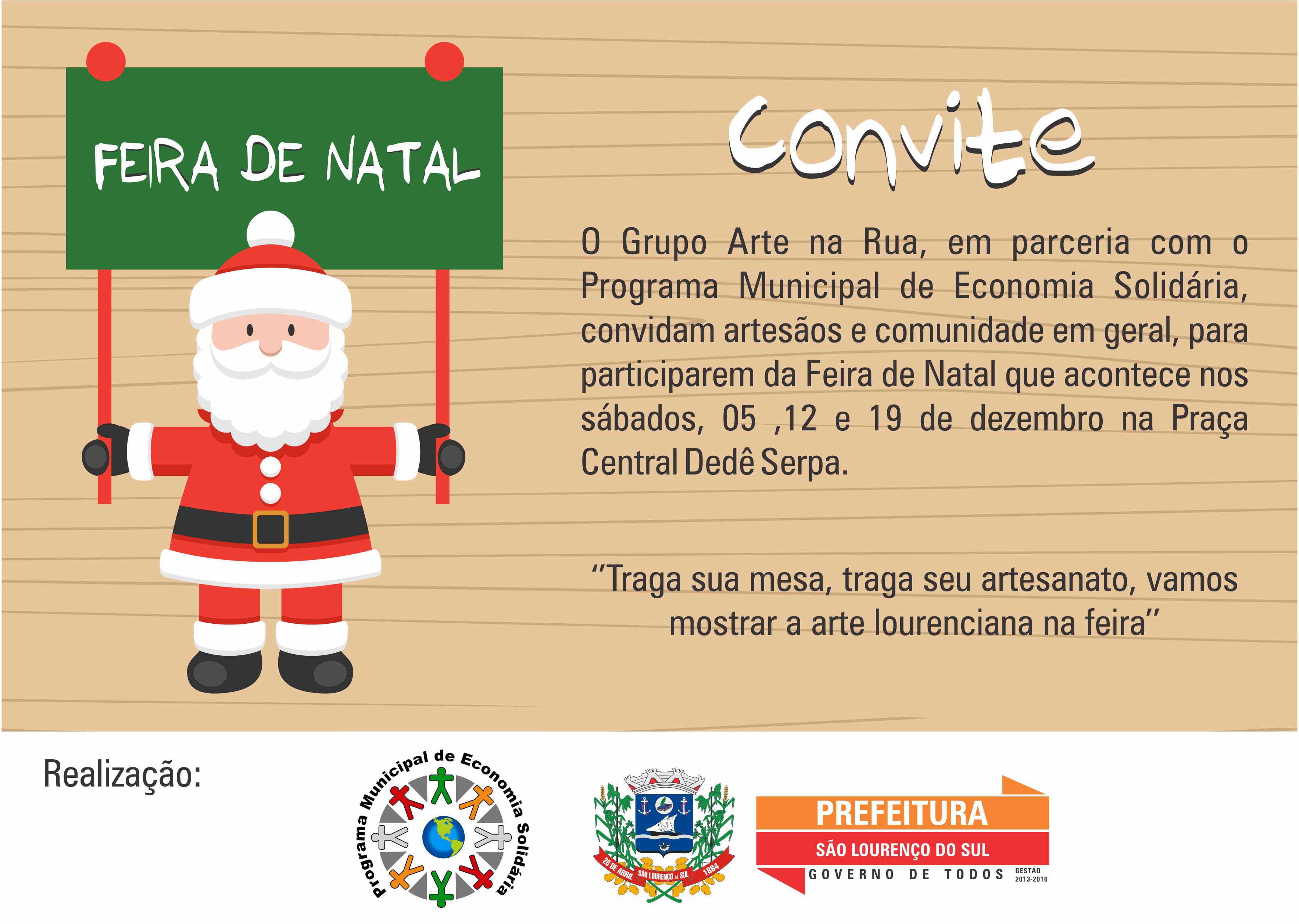 A Prefeitura, através da Secretaria de Turismo, Indústria e Comércio – Departamento de Economia Solidária, em parceria com o Grupo Arte na Rua realiza nos sábados 05, 12 e 19 de dezembro, a tradicional Feira de Natal na Praça Central Dedê Serpa. Durante a atividade os artesãos lourencianos estarão comercializando seus produtos.